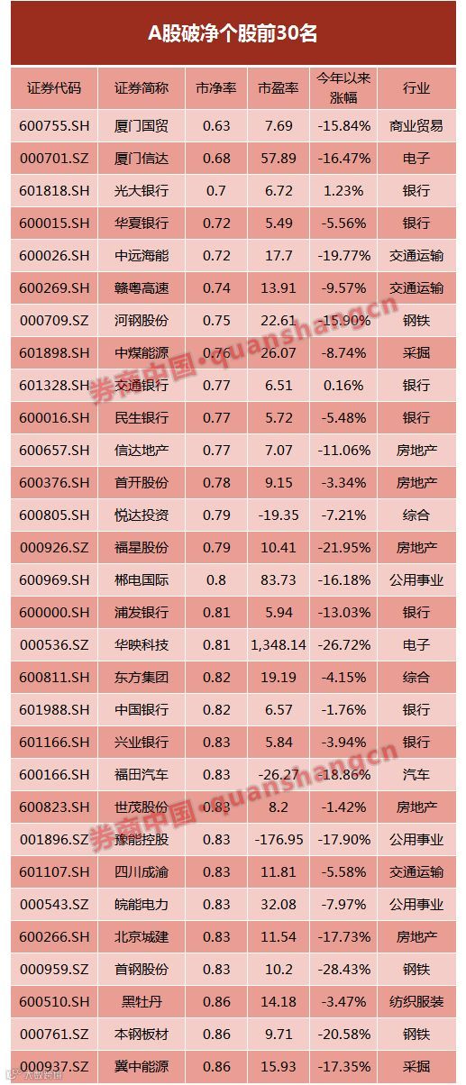 就整体破净幅度来看,上述82只破净股中,有46股的市净率低于0.9倍,有15股市净率低于0.8倍,同时还有2股的市净率低于0.7倍。