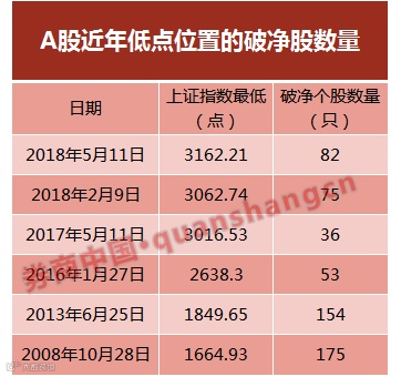 不过,在上一轮熊市低点的1849.65点(2013年6月25日)位置,A股的破净个股数量曾达到过154只,仍是目前破净数量的1.8倍左右,当然彼时上市公司数量与现在早已不能同日而语。