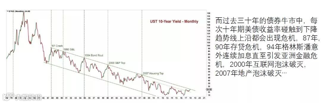 ✪ 过去三十年的债券牛市中,每次十年期美债收益率碰触到下降趋势线上沿都会出现危机,87年,90年存贷危机,94年格林斯潘意外连续加息直至引发亚洲金融危机,2000年互联网泡沫破灭,2007年地产泡沫破灭…