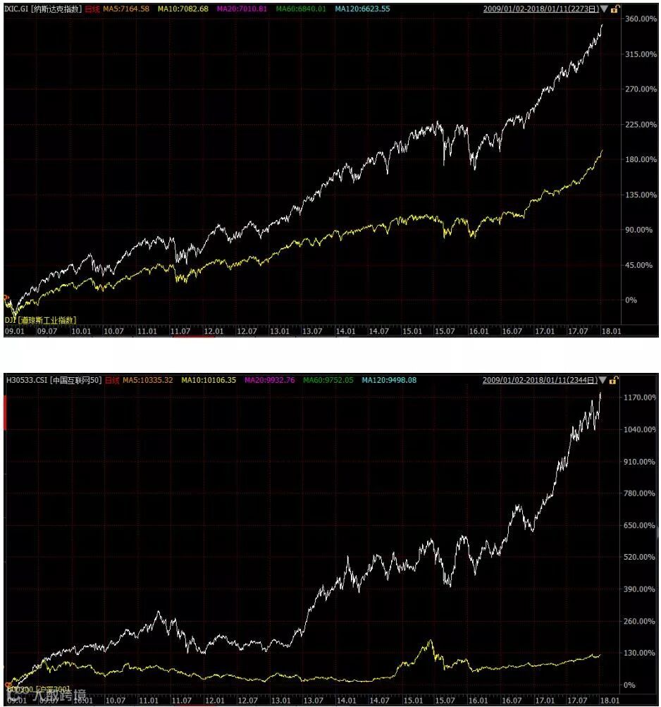 (上图是代表科技创新的纳斯达克指数表现远优于道琼斯指数,下图是过去十年代表科技创新的中概互联指数涨幅远超沪深300)
