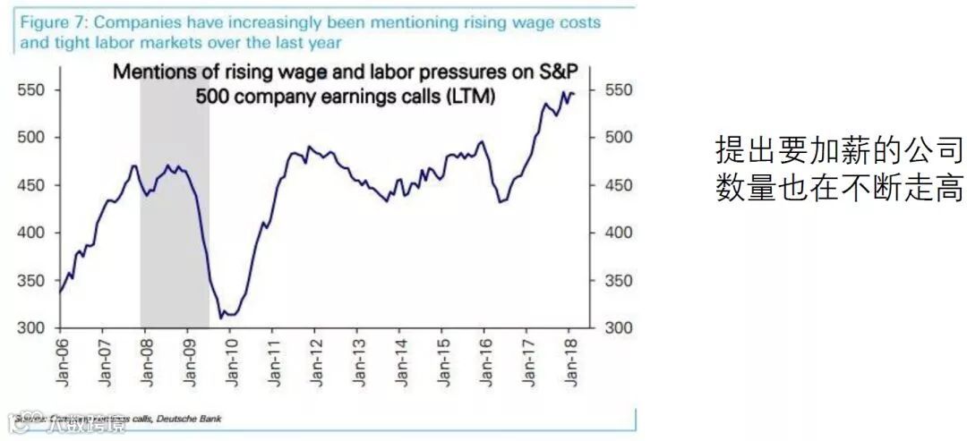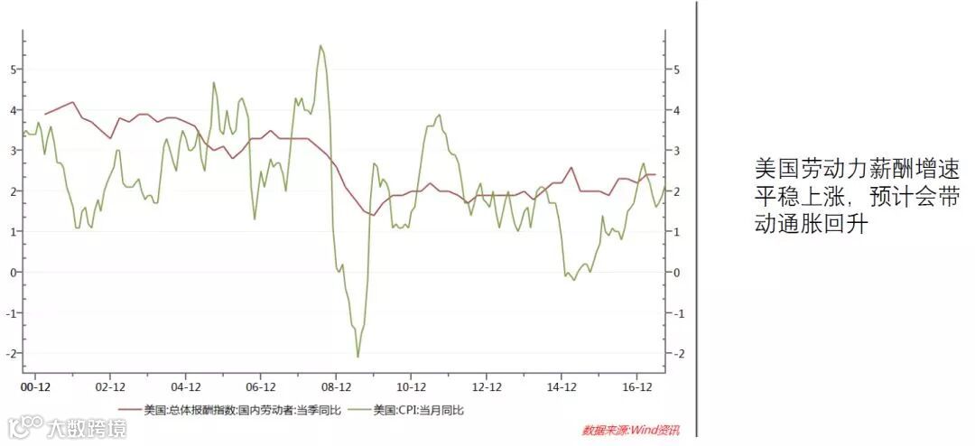 美国失业率在不断下行,但薪资增长并不明显,随着劳动力市场的闲置进一步下降,可以观察到薪资增速的中枢在向上抬升,美国的税改导致大量企业转回海外现金,回流后提升薪酬水平,也构成了薪资增长的动力。