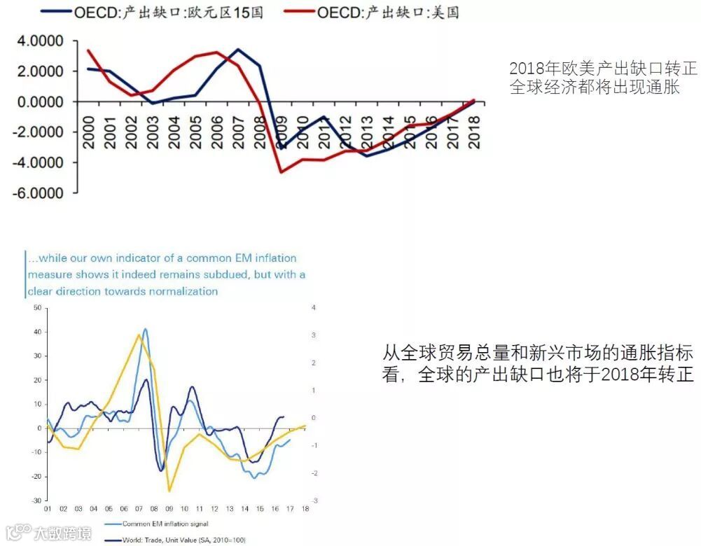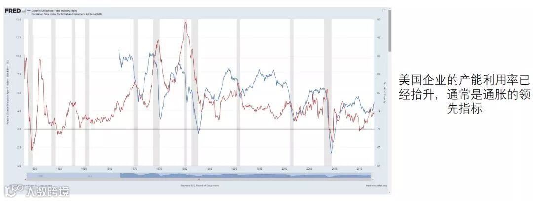 次贷危机以来,主要发达经济国家通过量宽的政策修复企业部门和居民部门的资产负债表,这一过程可能接近尾声,可以观察到再杠杆的趋势,企业投资加速,居民消费回升。综合的产能利用率在走高,从长周期来看是通胀的领先指标。