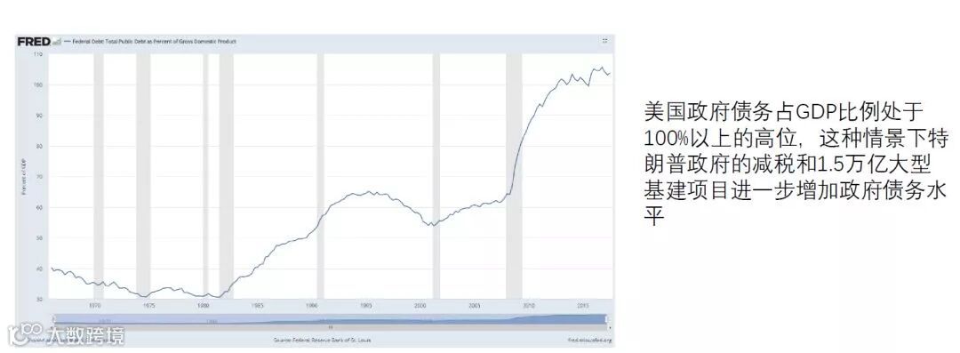 美国政府债务占GDP比例处于100%以上的高位,这种情景下特朗普政府的减税和1.5万亿大型基建项目进一步增加政府债务水平。