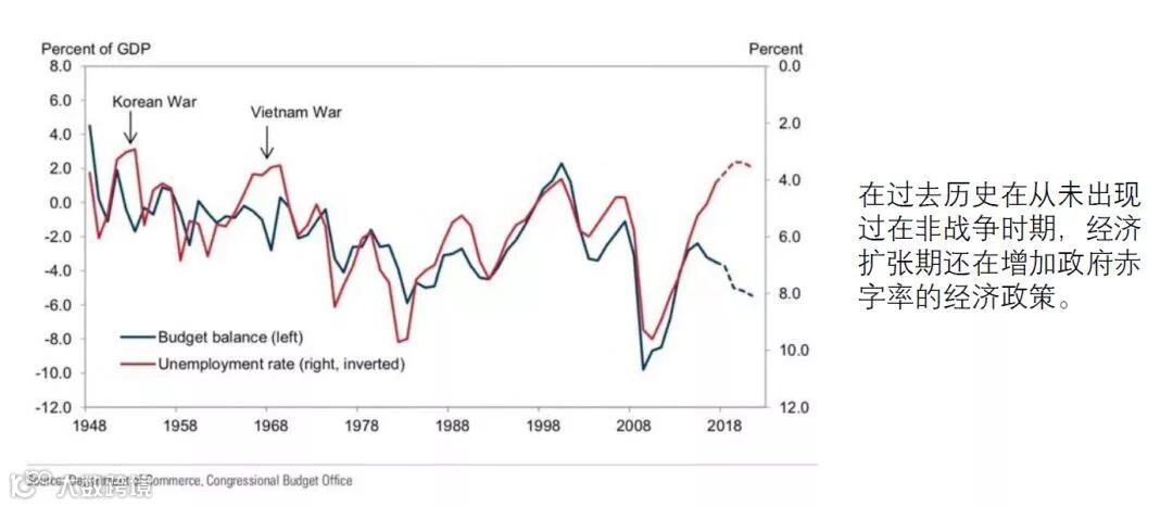 顺周期的货币政策历史罕见,回顾美国失业率和财政扩张的关系,仅仅在越南战争和朝鲜战争阶段发生背离,而当前并非出于战争阶段。