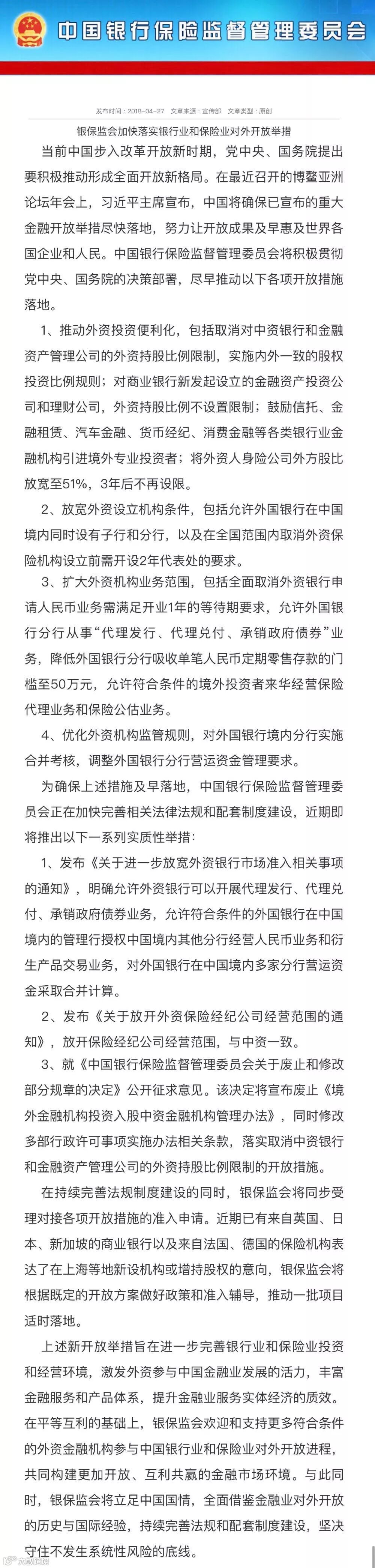 4月27日,银保监会发布公告称,要尽早推动以下各项开放措施落地,与此同时,为确保开放措施及早落地,银保监会正在加快完善相关法律法规和配套制度建设,近期即将推出一系列实质性举措。