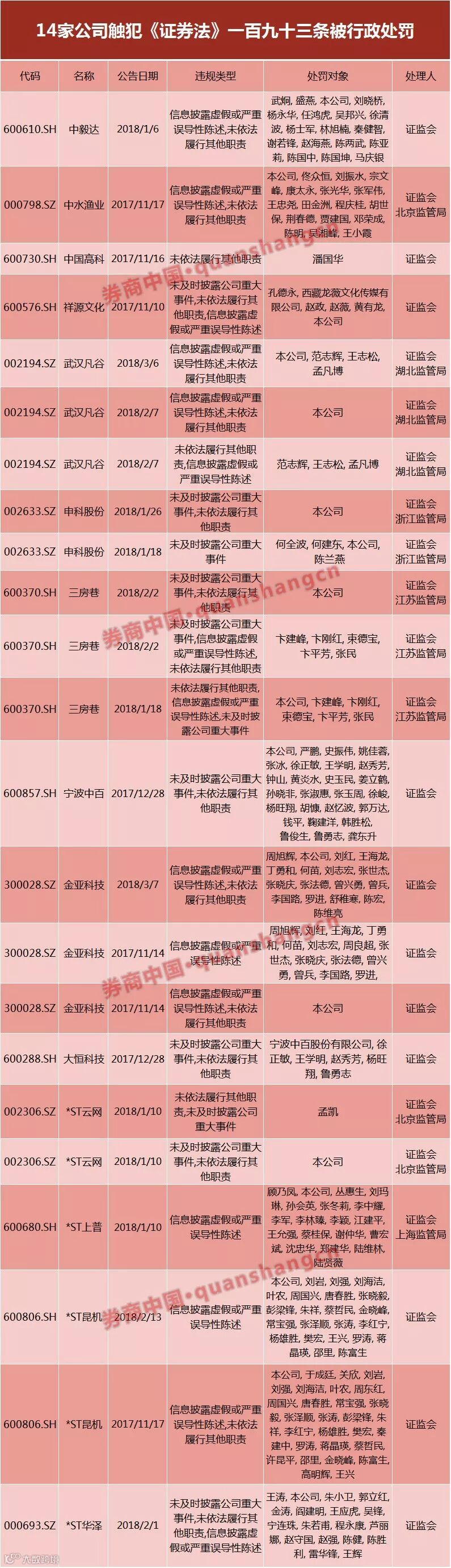 此外,中水渔业、中国高科、祥源文化、宁波中百和大恒科技也曾受到证监会的行政处罚。