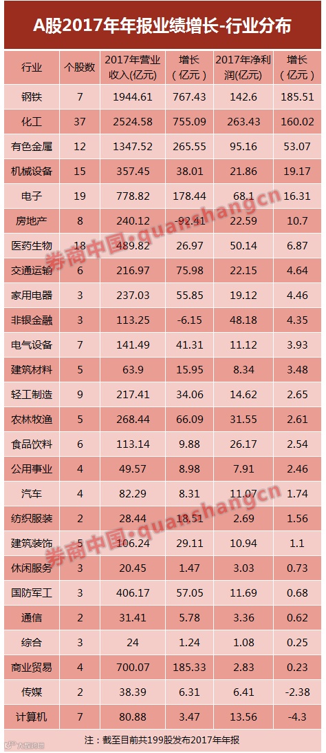 此外,钢铁与化学板块在2017年强力复苏,多家公司结束亏损、实现盈利,带动上述199家公司整体业绩大幅增长,譬如:
