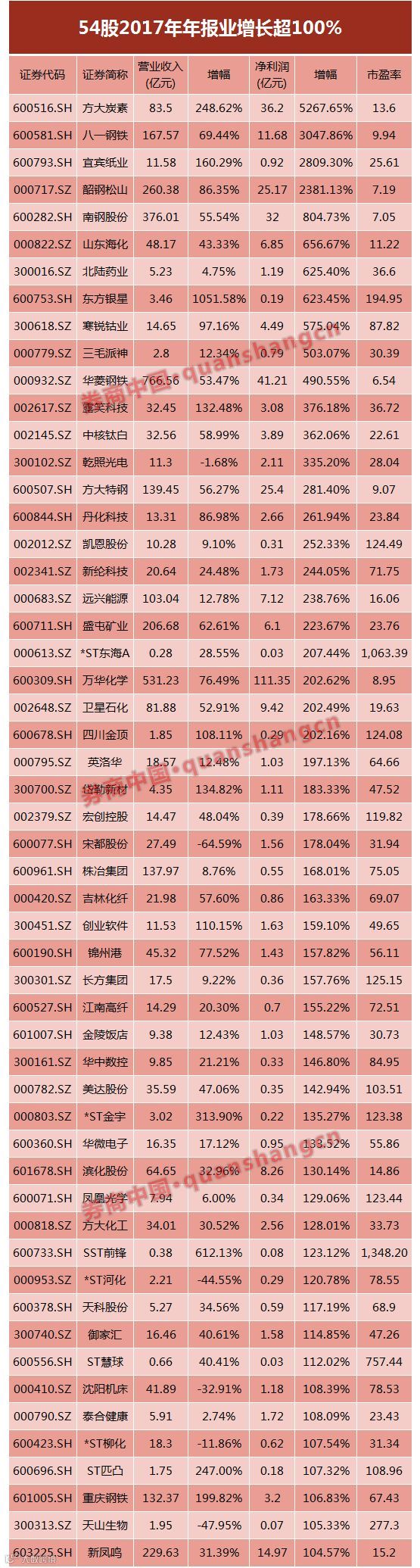 整体来看,上述199股中有54股业绩增幅超100%,25股增长超200%,15股增幅超300%,11股增长超500%,方大炭素、八一钢铁、宜宾纸业、韶钢松山等4股增长超10倍。