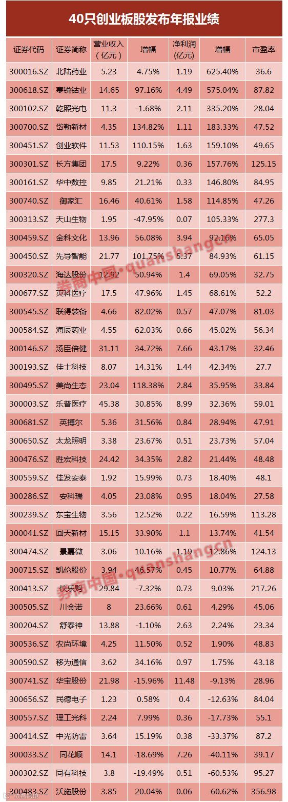 创业板40股年报盈利增27.44%