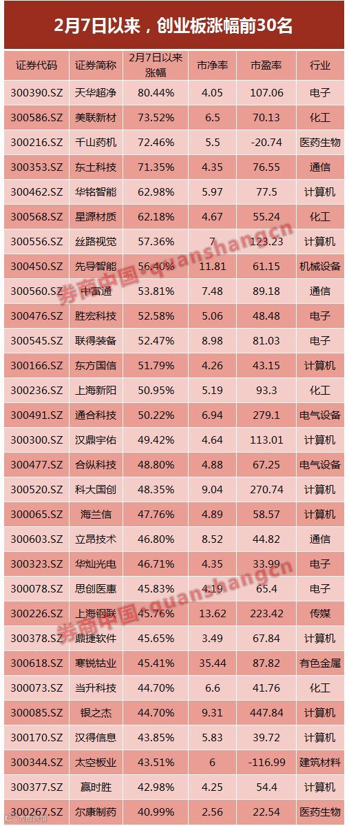 更牛的是创业板个股。不计次新股,从2月7日以来,创业板有14股涨幅超过50%,天华超净、美联新材、千山药机和东土科技的期间涨幅更是超过70%,分别达到80.44%、73.52%、72.46%和71.35%。