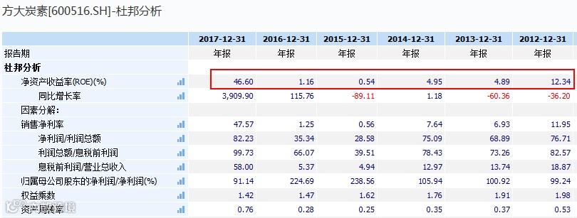 相较之下,方大炭素2014年、2015年和2016年的销售毛利率分别只有29.3%、23.96%和25.4%,加权ROE分别为4.91%、0.54%和1.16%。