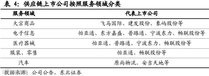 东北证券表示,供应链行业属于依赖客户型,根据服务的客户类型不同可以进行分类。供应链管理可以提高企业对市场的快速反应能力以及降低成本,因此往往发展成熟的大规模行业,且具有产品需求量大,采购全球化,要求快速进行周转,逐步开始从重视采用第三方专业供应链服务,典型的包括大宗商品、电子信息、医疗器械、汽车以及服装零售。