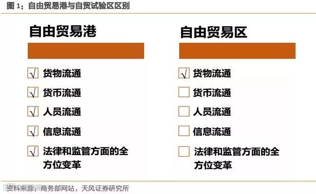 天风证券表示,对比自贸试验区,自由贸易港与之最大的区别在于:自贸区仅侧重于货物流通方面的开放,而自贸港则是全方位的开放,包括货物流通、货币流通、人员流通、信息流通,以及法律和监管方面的全方位变革。