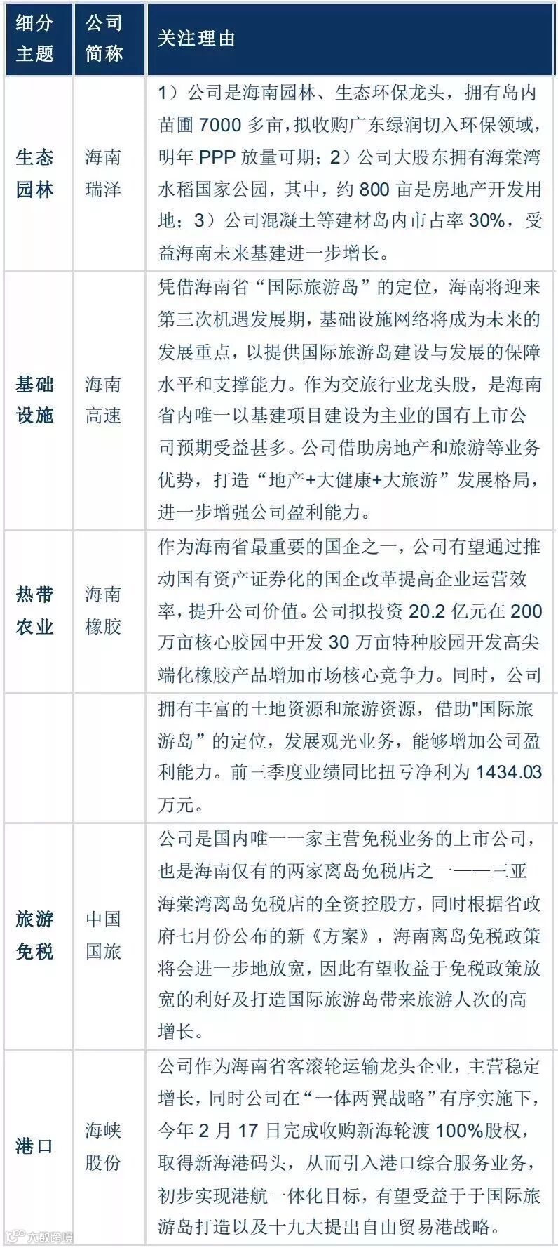 基建、港口、航空建设或是“重中之重”所在, 建议重点关注生态园林、旅游、本地建材、港口及航空及税收优惠等五大细分方向。建议重点关注:海南瑞泽、海峡股份、中国国旅、海南高速、海南橡胶, 主要关注海南瑞泽、中国国旅。