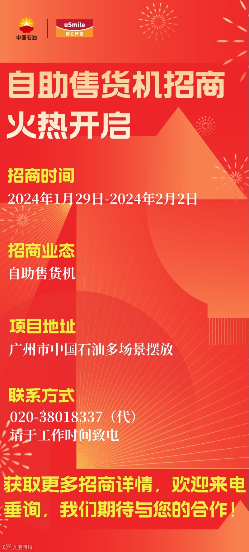我们计划在广州市内中国石油站点多场景摆放自助售货机,为广大车主提供方便快捷的食品选择,现面向社会招商,详情见海报。