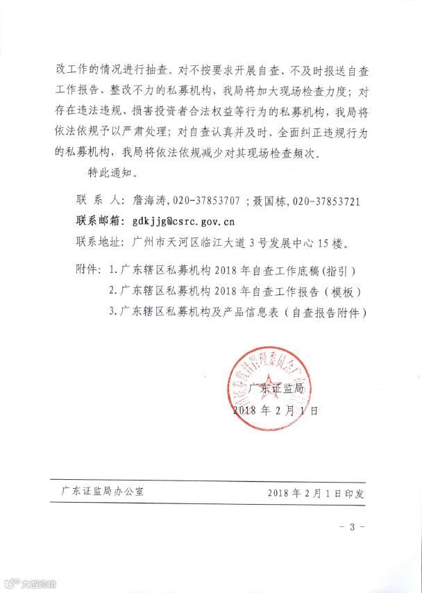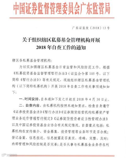 券商中国记者获悉,近日深圳多家私募收到了广东证监局2月1日印发的《关于组织辖区私募基金管理机构开展2018年自查工作的通知》,正式拉开2018年地方私募自查工作的序幕。