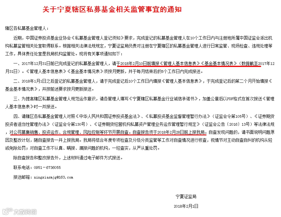与此同时,2月1日宁夏证监局也发布私募监管通知,要求私募管理人填报《管理人基本信息表》、《基金基本情况表》,对公司募集销售、投资运作、合规管理、风险控制等环节开展自查,并于2月28日提交自查报告。