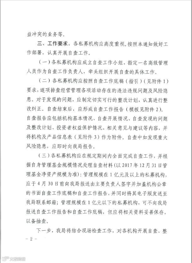 证监局要求按照私募管理规模大小的不同决定是否提交自查工作报告,具体为:
