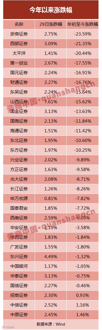 不过,券商板块今年以来的走势并不如人意。27家券商年初至今股价下跌,其中,浙商证券、西部证券和太平洋跌幅超过20%,分别为23.59%、21.35%和20.44%,第一创业、国元证券、财通证券、东吴证券等10家券商今年跌幅超过10%;仅三家券商年初至今股价上涨,但累计涨幅都不超过2%,分别是中原证券涨1.46%、中信证券涨1.16%、招商证券涨0.93%。