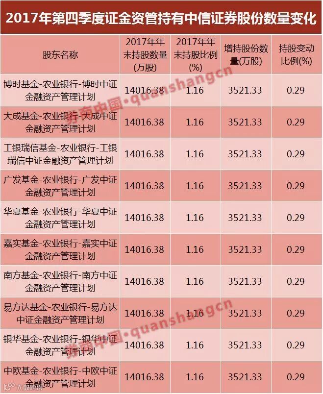 值得注意的是,证金十大资管计划在去年第四季度集中增持了中信证券。十个资管计划分别增持了3521.33万股,累计增持3.52亿股,以中信证券去年第四季度的成交均价18.49元计算,证金十大资管计划耗资65.09亿元。