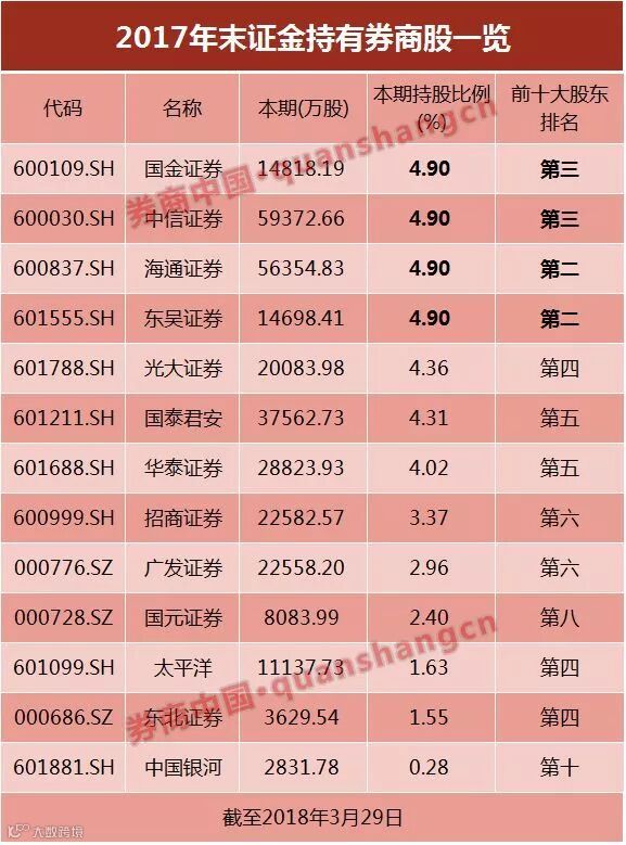 其中,证金持股比例为4.9%的证券公司共有4家,分别是国金证券、中信证券、海通证券、东吴证券,均位居4家券商前三大股东。