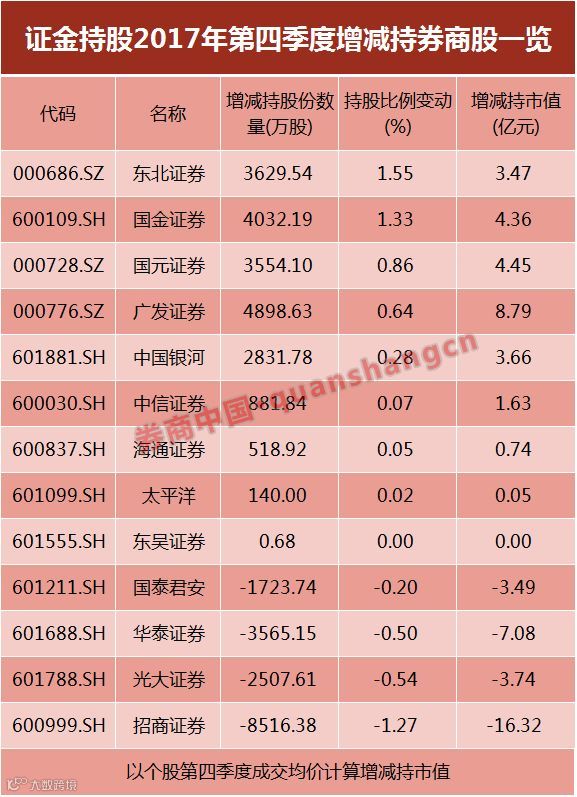 去年第四季度证金公司对9家券商进行了增持,分别是东北证券、国金证券、国元证券、广发证券、中国银河、中信证券、海通证券、太平洋、东吴证券,预计耗资27.16亿;