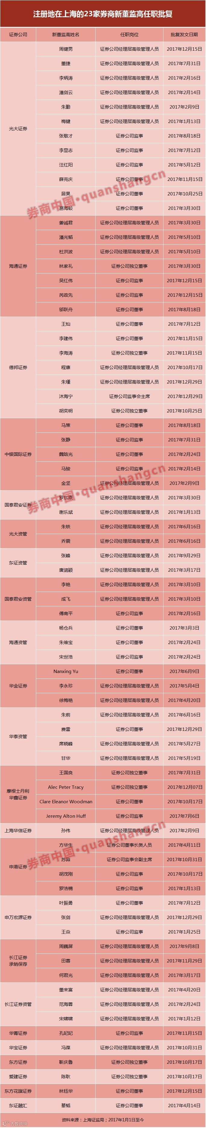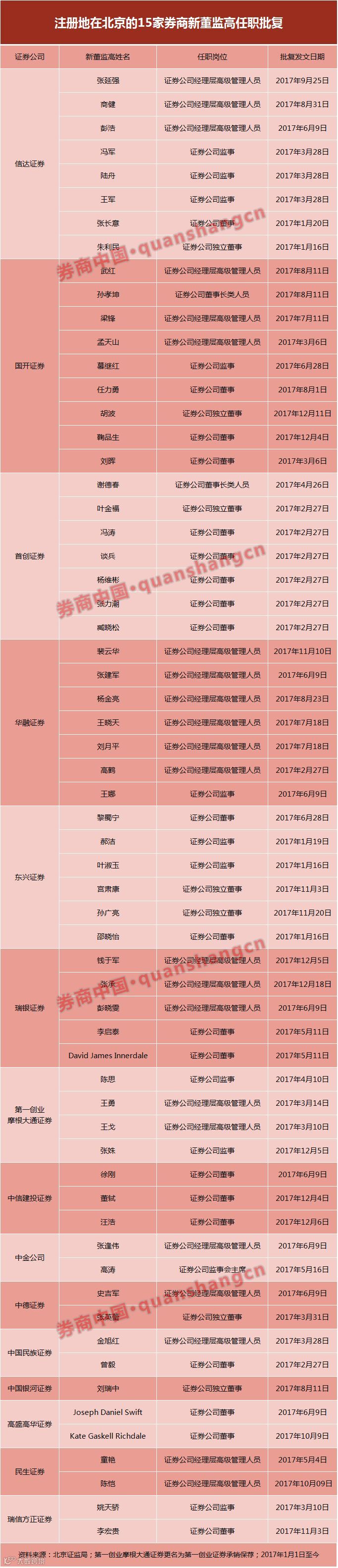 需要特别提出的是,本报道的统计是基于各地证监局正式下发的证券公司董事(含董事长、副董事长、监事会主席)监事及经理层高级管理人员任职资格核准批复公告或文件,即为监管层确认履职的券商新董监高名单,包括券商外部“挖人”和券商内部升迁。实际上2017年还有部分券商拟任的董监高已入驻券业,但任职资格的申请尚待审批。