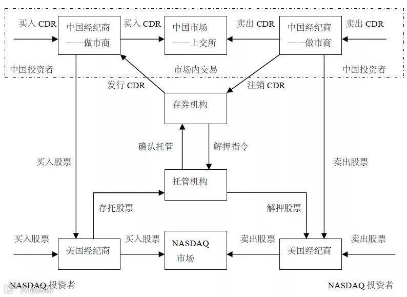 在交易过程中,存券机构的主要作用是设计CDR结构,建议CDR和基础证券的比例,完成CDR注册工作,制定托管机构,为CDR持有者提供转让和登记服务等,而托管机构的主要职责包括了在境外持有基础证券,就股票存托事件通知存券机构,将发行者支付的红利汇给存券机构等。