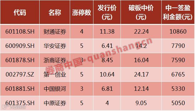 据券商中国记者统计,6只券商股涨停数均未超过5个,涨停数最少的只有3个,分别是浙商证券和中国银河。盈利方面,中一签赚得最多的是财通证券,为10860元,也是6只券商股中唯一收益超1万元的。