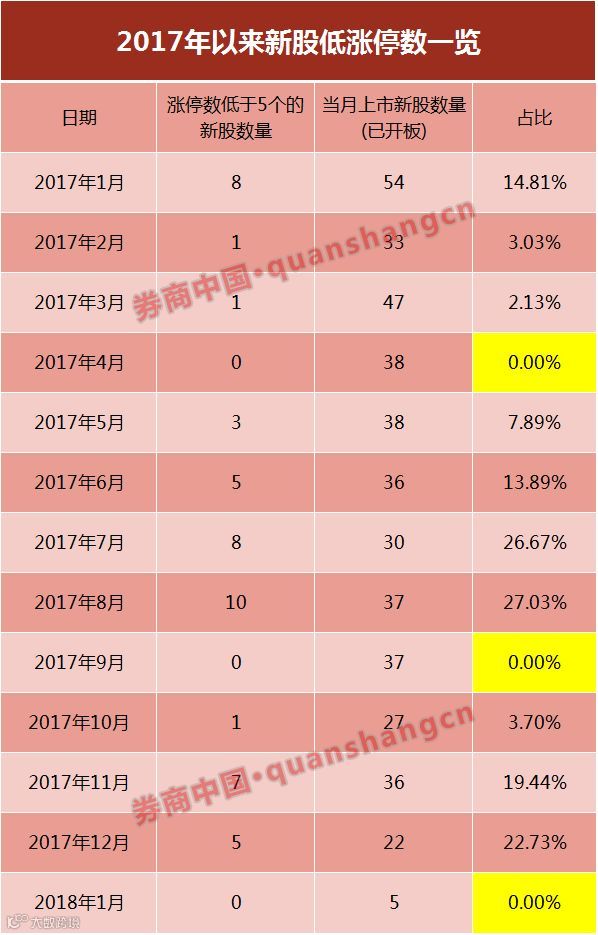 据券商中国记者统计,2017年12个月份中,仅4月份和9月份,新股涨停数均超过5个(包含)。从涨停数低于5个的新股数量占比来看,2017年有两大峰值,分别是2017年7-8月份和11-12月份。
