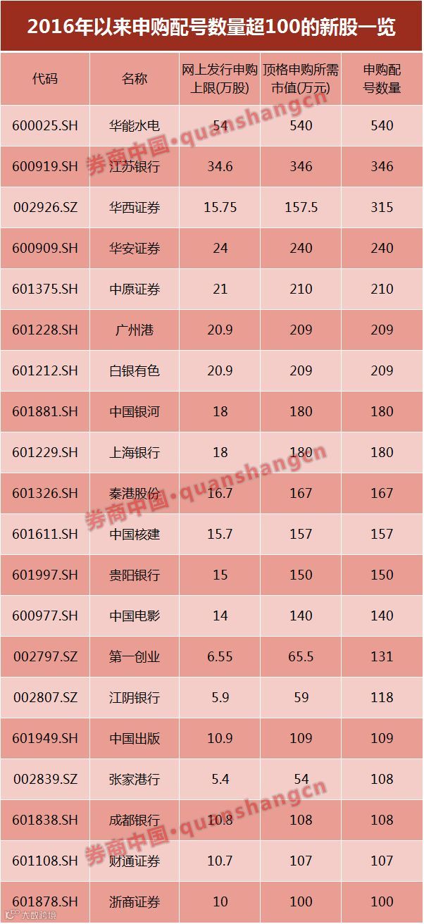据券商中国记者统计,2016年以来,申购配号数量超过300个的新股仅3只,分别是华能水电、江苏银行、华西证券。值得注意的是,华能水电、江苏银行同时也是两年来顶格申购下100%中签的新股。
