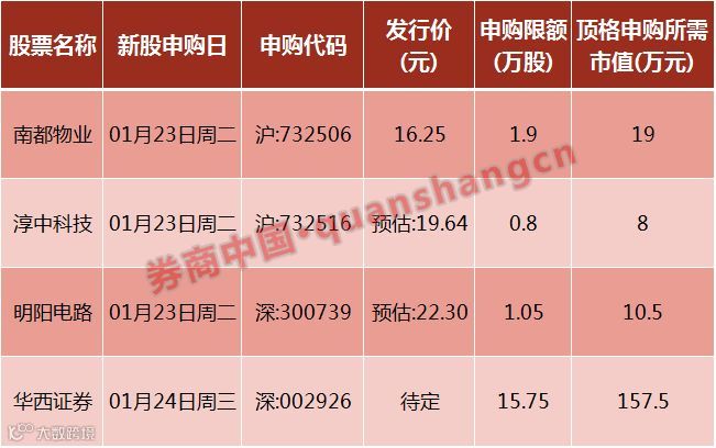 除华西证券外,本周还有3只新股,分别是南都物业、淳中科技、明阳电路,均于本周二(1月23日)申购。其中,南都物业将作为首只物业股登陆A股市场,表现也备受市场关注。