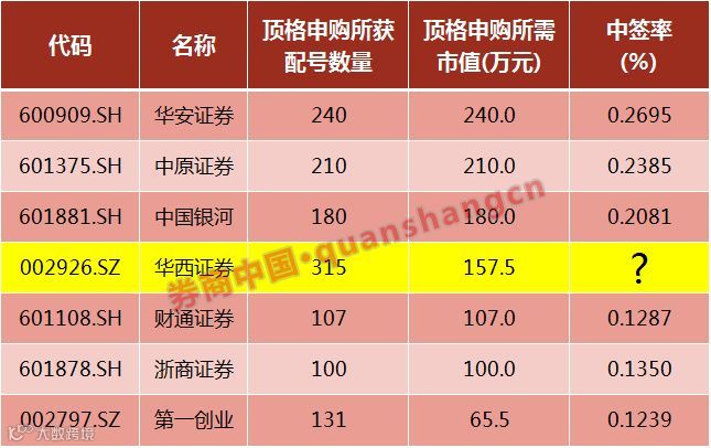 据券商中国记者统计,新股申购新规实施以来,共有6只券商股发行上市,其平均中签率为0.2%,远高于其他新股。以此计算,顶格申购华西证券的中签概率将超过60%。