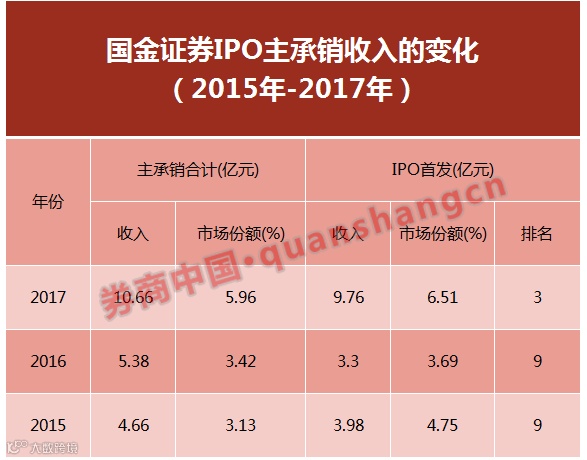 要说前十大券商中,IPO主承销收入排名进步最大的投行要数国金证券,从2016年的第9位跃升至2017年的第3位。