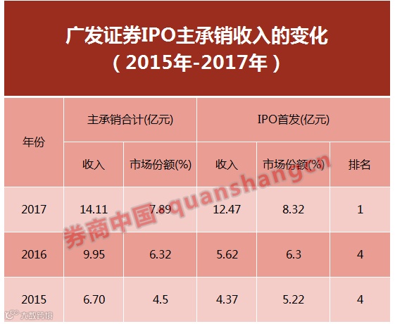 单纯看2017年的IPO首发主承销收入,广发证券是12.47亿元,市场份额为8.32%,超过了中信证券12.40亿元的收入和8.27%的市场份额。