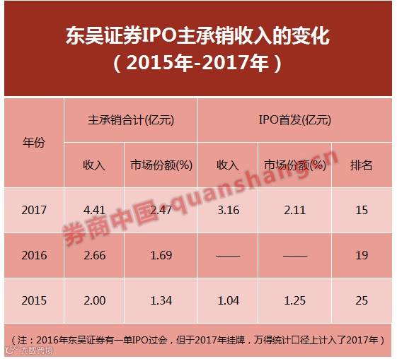 证券IPO主承销收入从排名第9跃升至第3,东吴证券则从没有IPO进账到拥有11个项目,广发证券在IPO主承销收入上超过了中信证券居第一。