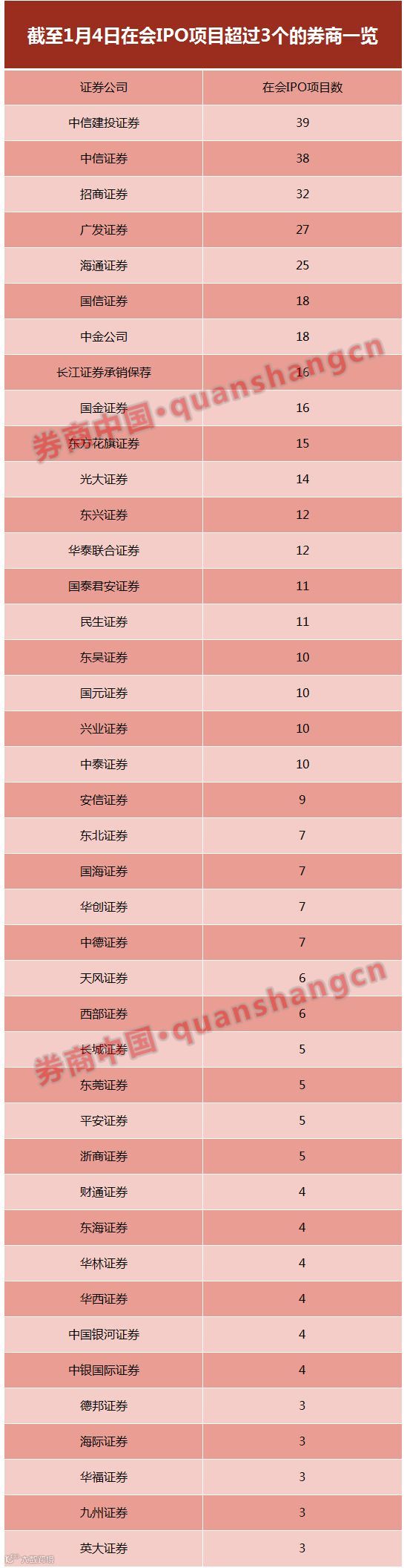 券商中国记者据证监会最新公布的IPO在审项目(正常审核状态)情况进行统计,截至1月4日,中信建投证券储备IPO项目最多,上交所19家,深交所中小板5家,深交所创业板15家,合计39家。紧随其后的是中信证券,保荐企业合计为38家;招商证券以32个IPO储备项目,位居第三。