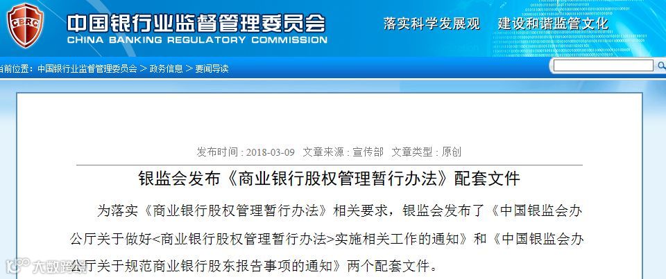 3月9日,为解决当前商业银行股东和股权方面存在的一些乱象,加强商业银行股权监管,规范商业银行股东行为,落实《办法》,银监会发布《关于做好<商业银行股权管理暂行办法>实施相关工作的通知》和《关于规范商业银行股东报告事项的通知》两个配套文件。