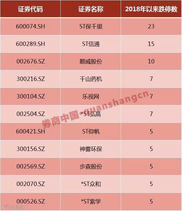 数据显示,进入2018年以来,跌停数超过5个的股票共有11只,分别是ST保千里、ST信通、顺威股份、千山药机、乐视网、*ST弘高、ST仰帆、神雾环保、步森股份、*ST众和、*ST紫学。