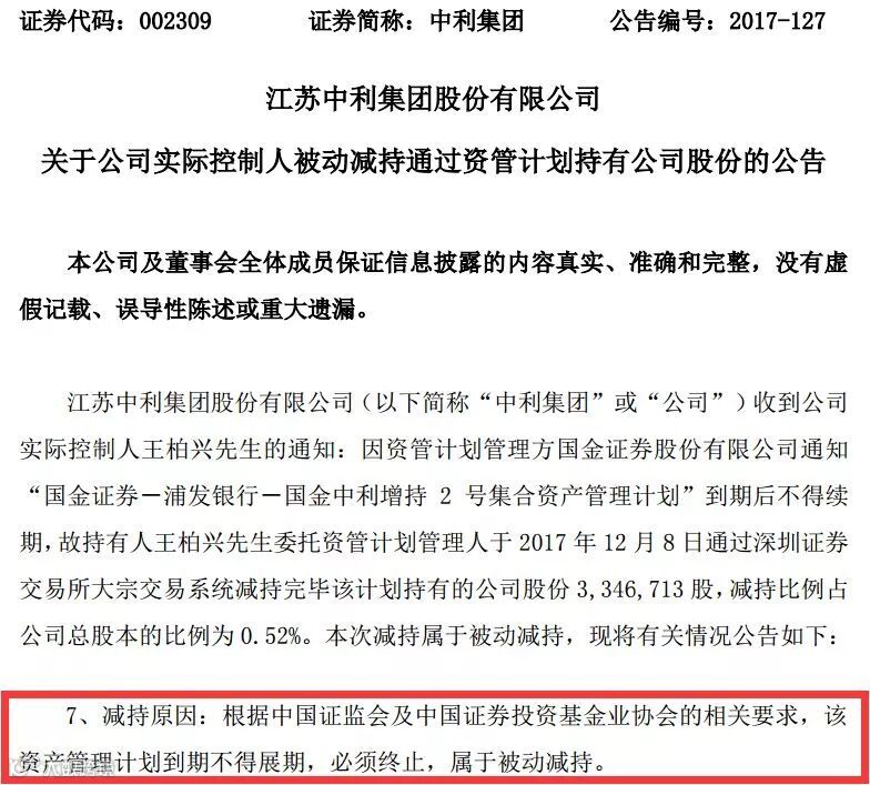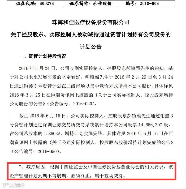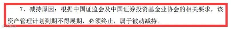 根据中国证监会及中国证券投资基金业协会的相关要求,该资产管理计划到期不得展期,必须终止,属于被动减持。