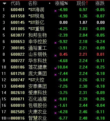 以今日收盘价来看,股价低于2.5元的个股共有18只,低于2元的个股3只,分别是*ST海润、*ST锐电、*ST新亿。