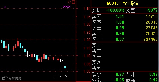 此外,多年不见的“仙股”又在A股市场出现:*ST海润今日再度跌停,股价跌破1元,报收0.97元,成为当下A股唯一一只“仙股”。