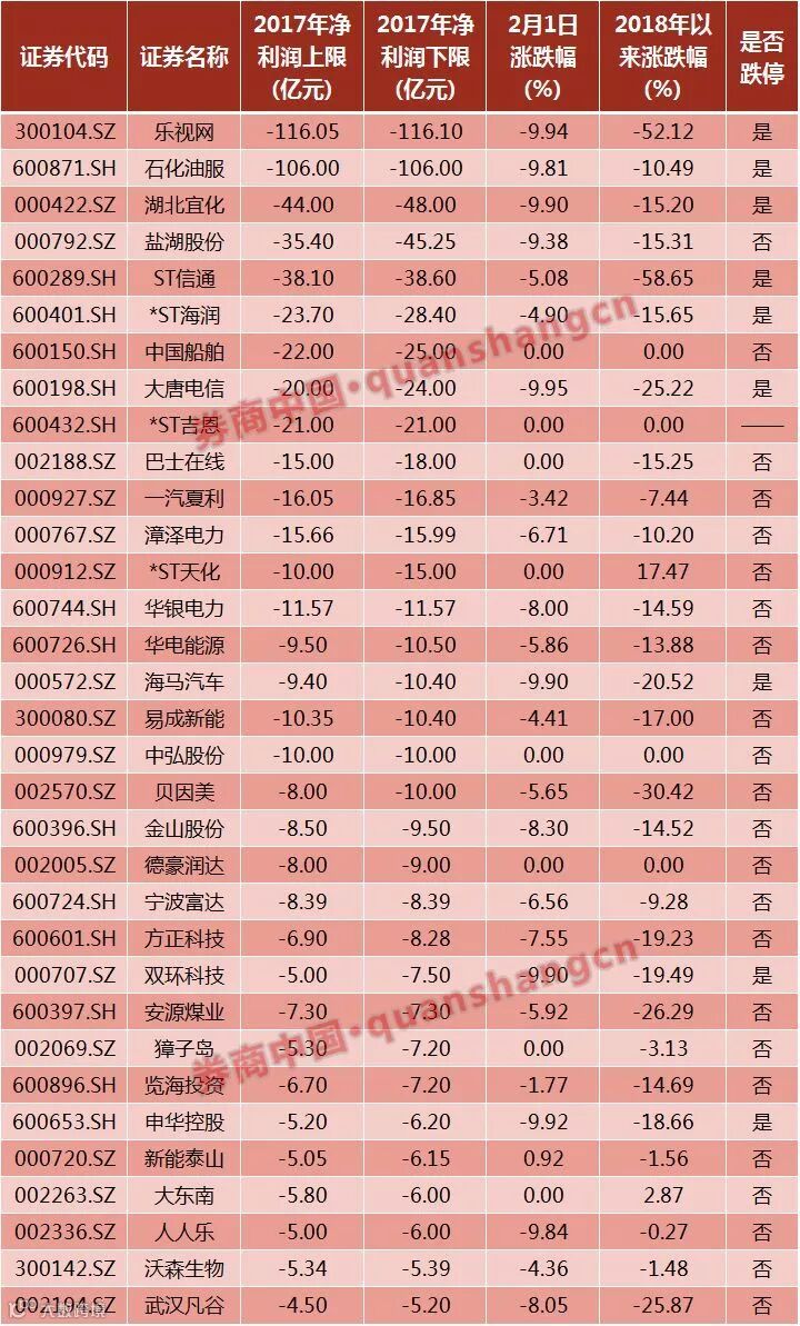 2017年年报预告数据显示,亏损5亿元以上的个股共有33只,亏损超过10亿元的也有19只。
