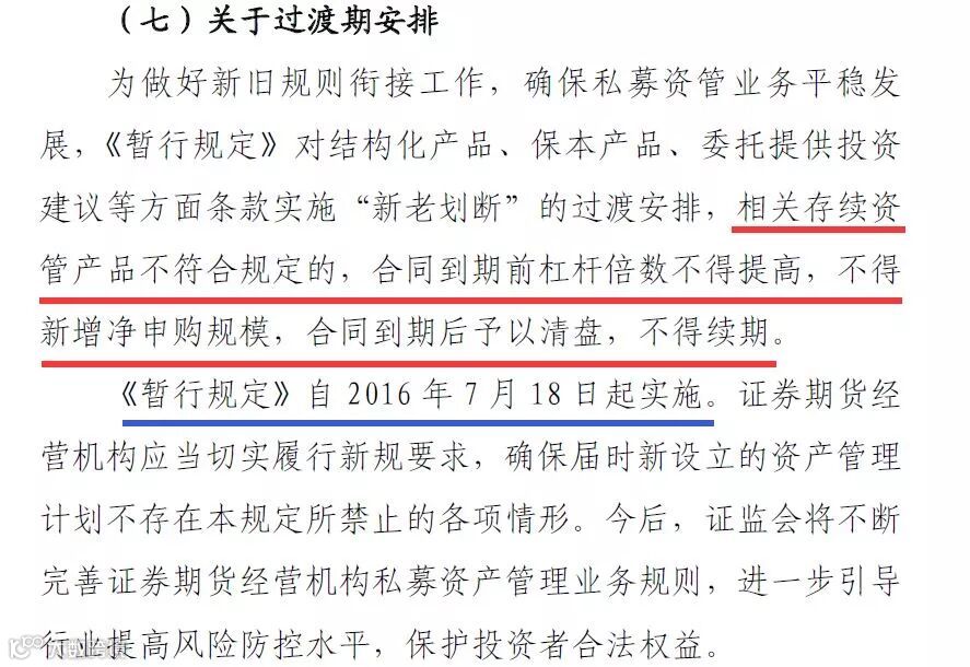 相关存续资管产品不符合规定的,合同到期前杠杆倍数不得提高,不得新增净申购规模,合同到期后予以清盘,不得续期。《暂行规定》自2016 年7月18日起实施。