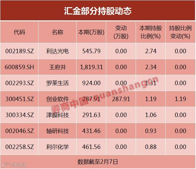 据券商中国记者统计,截至2月7日,汇金最新持股名单中共有7只个股,分别是利达光电、王府井、罗莱生活、创业软件、津膜科技、轴研科技、利尔化学。
