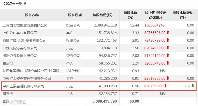 值得注意的是,证金公司凭借3.68%的持股比例,已经跃升至安信信托的第二大股东,而在2017年一季度末,证金公司还是安信信托的第九大股东。