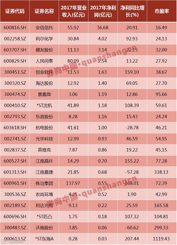 上述20家公司2017年净利润超过1亿元的共有10家,分别是安信信托、利尔化学、健友股份、人民同泰、创业软件、海达股份、景嘉微、*ST沈机、东音股份、杭电股份,其中,仅杭电股份净利同比出现下滑。
