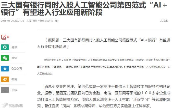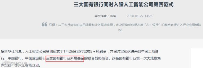 这两天,不少人被三大国有银行集体出动投资人工智能公司“第四范式”的消息刷屏了: