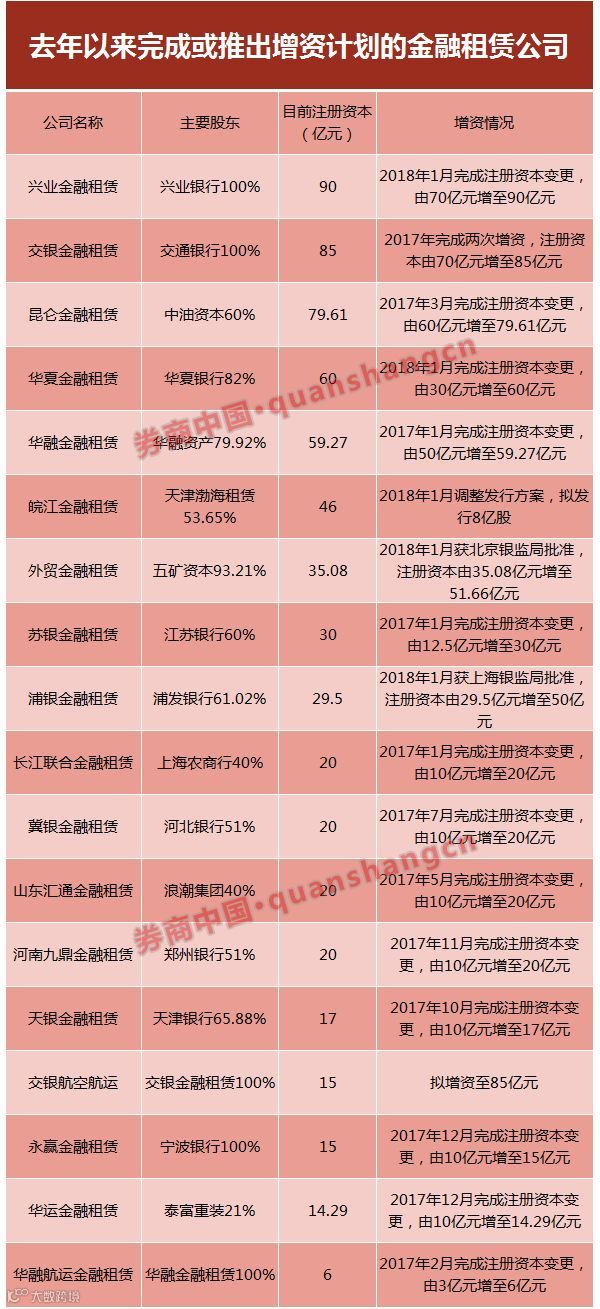 对于国内金融市场来说,更大亮点在于金融租赁全行业出现最大规模增资!