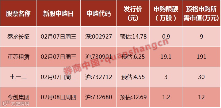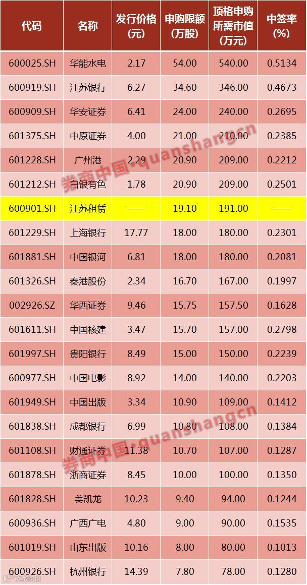 我们先来看看江苏租赁周三(2月7日)申购的基本信息,发行价预计6.26元,发行量为6.4亿股,申购上限为19.1万股,顶格申购所需沪市市值为191万元,数据显示,申购限额与中签率成正相关,申购限额超过18万股的新股中签率从未低于0.2%。这也意味着,截至目前,江苏租赁有望成为今年来两市中签率最高的新股。
